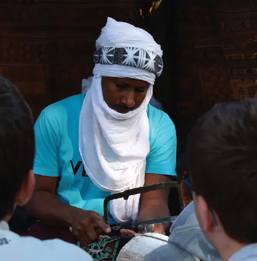 Fabriquer, déguster et revêtir… Rencontre Abdou, du Niger, et Mohamed, du Mali, bijoutiers et artisan. Tu pourras y réaliser des bijoux traditionnels. De plus, le temps d’un instant, il te sera possible d’entrer dans la peau d’un touareg en endossant le turban