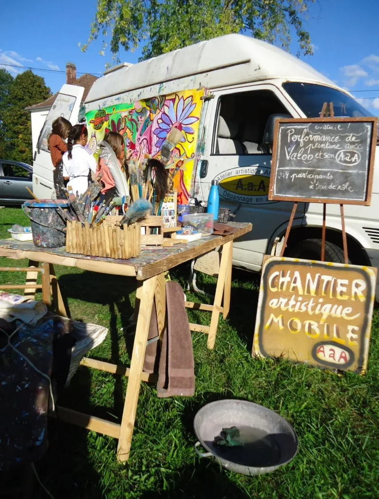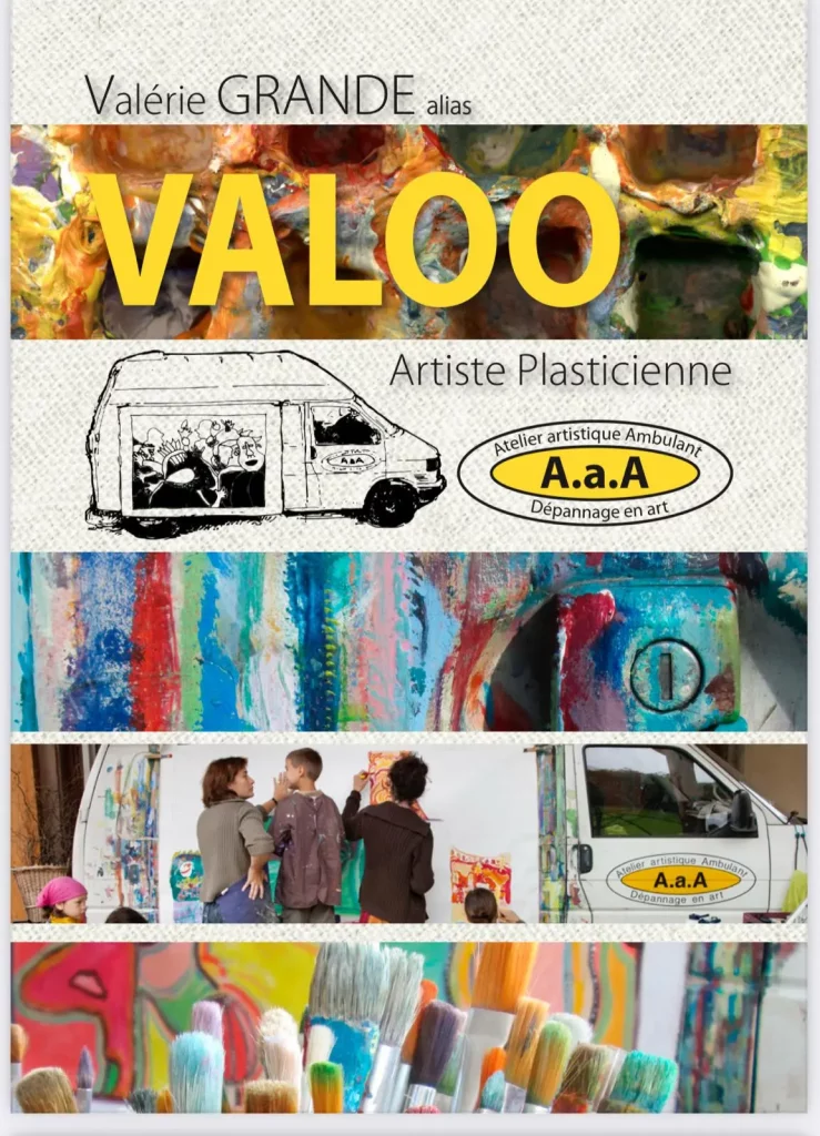 Valérie GRANDE alias VALOO, artiste plasticienne nomade se déplace dans les collectivités, les associations, les écoles et chez les particuliers avec son A.a.A© qui se transforme en chevalet mobile.