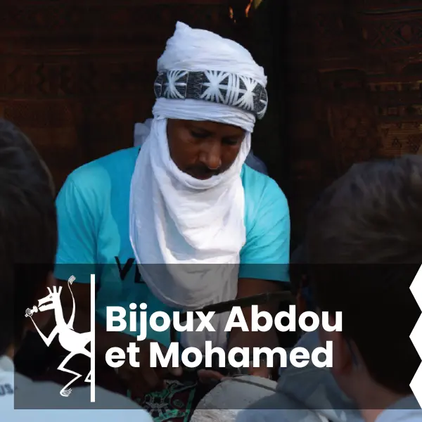 Fabriquer, déguster et revêtir… Rencontre Abdou, du Niger, et Mohamed, du Mali, bijoutiers et artisan. Tu pourras y réaliser des bijoux traditionnels. De plus, le temps d’un instant, il te sera possible d’entrer dans la peau d’un touareg en endossant le turban