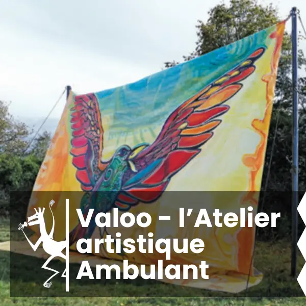 Valérie GRANDE alias VALOO, artiste plasticienne nomade se déplace dans les collectivités, les associations, les écoles et chez les particuliers avec son A.a.A© qui se transforme en chevalet mobile.